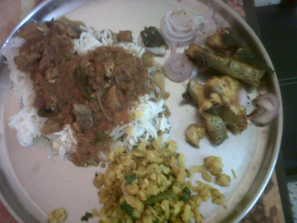 Well, this Sunday was spent cleaning up - our house was getting painted and hence, there was chaos all around. No 'Sunday Specials' were cooked. But I just found some pictures of a special Sunday lunch from not too long ago that I hadn't put up then - fish curry, fried fish, potato sabzi and rice. So I'm putting those up. Enjoy!